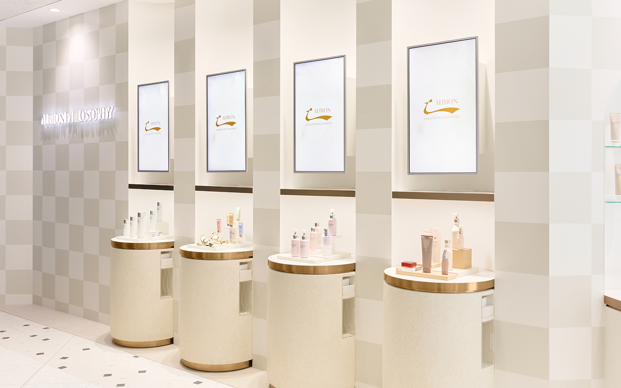 PHILOSOPHYは『Happyをむかえにいこう』をショップコンセプトに掲げ、アルビオン様が創業以来大切にしてきた「商品」と「接客」を通じ、お客様が訪れるたびに新しい発見と笑顔が生まれる特別な空間に、当社デジタルサイネージが貢献できるよう、サービスをご提供してまいります。